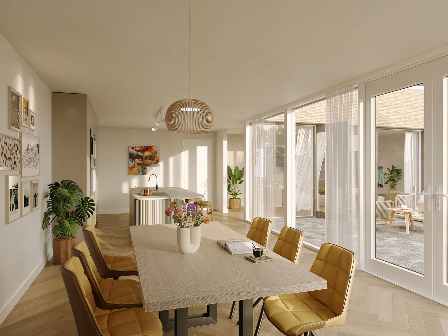Stel je voor terwijl de heerlijke geuren zich verspreiden, kijk je vanuit de hoge keukenramen uit over de tuin die met de seizoenen meeverandert. In dit huis is de keuken niet alleen een plek om te koken, het is het kloppend hart van gezelligheid.