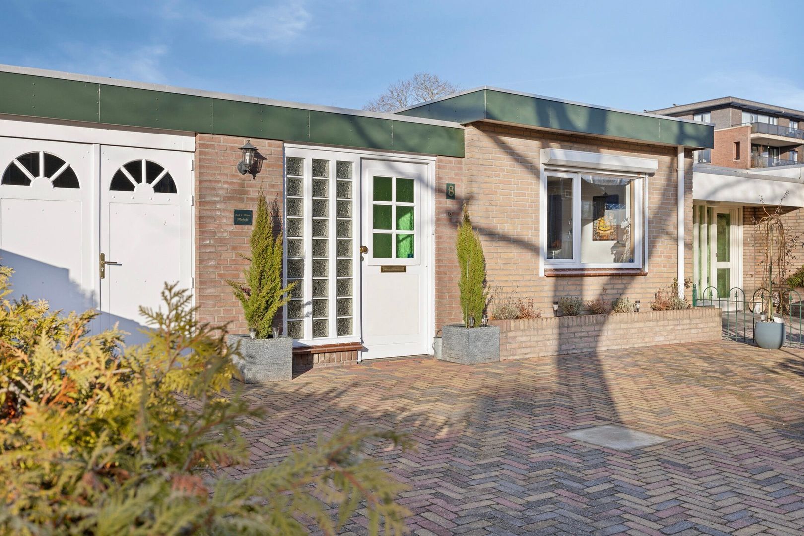 Aansluitend bevindt zich de aangebouwde, lichte tuinkamer met eveneens een natuurstenen vloer met vloerverwarming (2e circuit) en voor de sfeer een gashaard, die gemakkelijk is om te bouwen naar een echte houthaard. Via de tweede aluminium schuifpui in de tuinkamer is de overzichtelijke, privacy biedende patiotuin te bereiken. Deze is gelegen op het noorden en verhoogd aangelegd, waardoor optimaal gebruik wordt gemaakt van de zon.